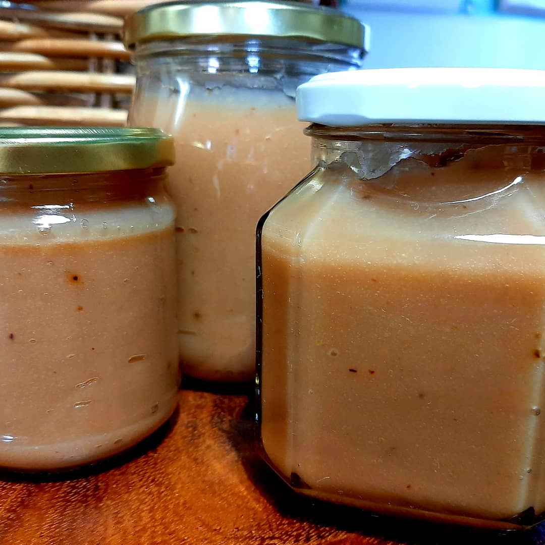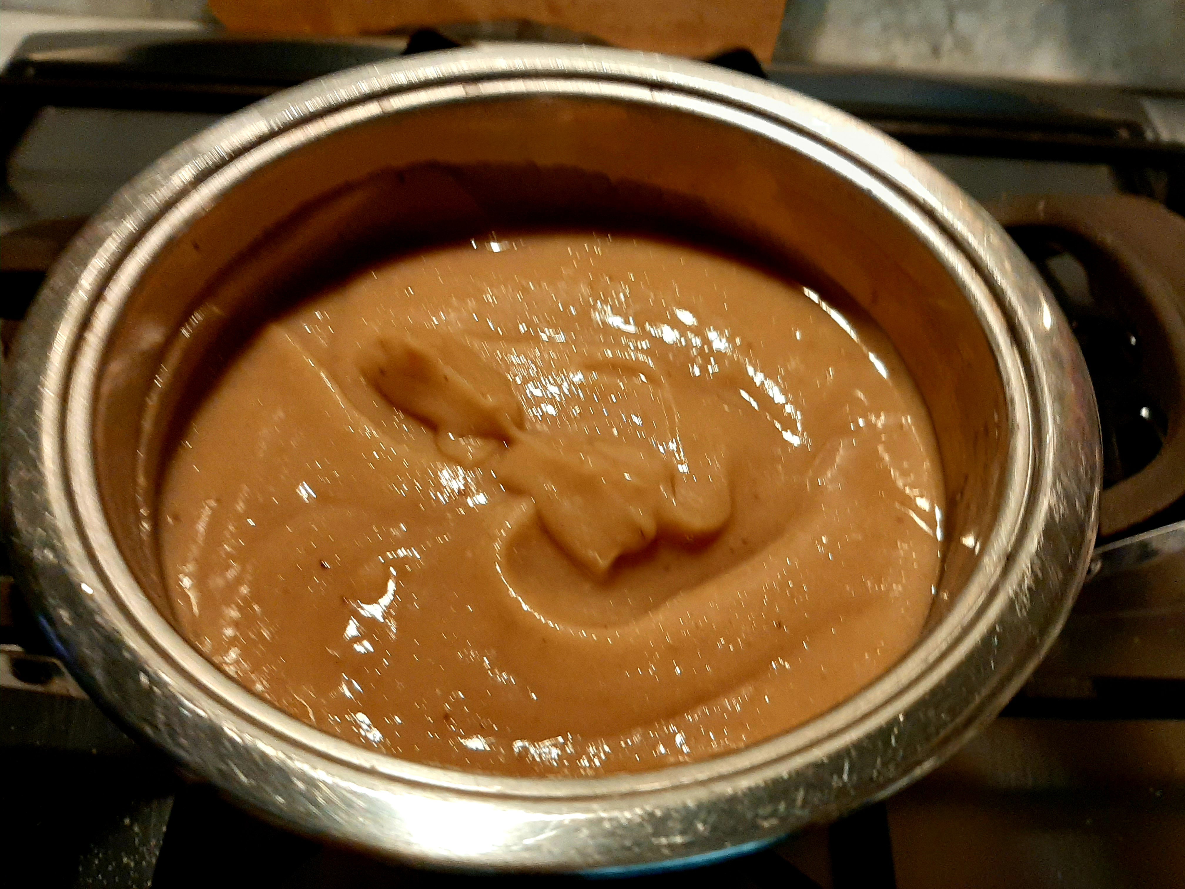 Versate la crema in una casseruola, aggiungete 1/4 del suo volume d’acqua e lo zucchero e ponetela sul fuoco. Continuate la cottura a fiamma bassa sempre mescolando, per circa 20 minuti. Aggiungete, se necessario, poca acqua calda, nel caso il composto fosse troppo denso.