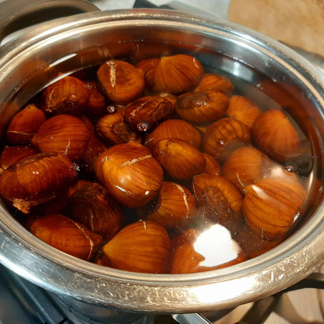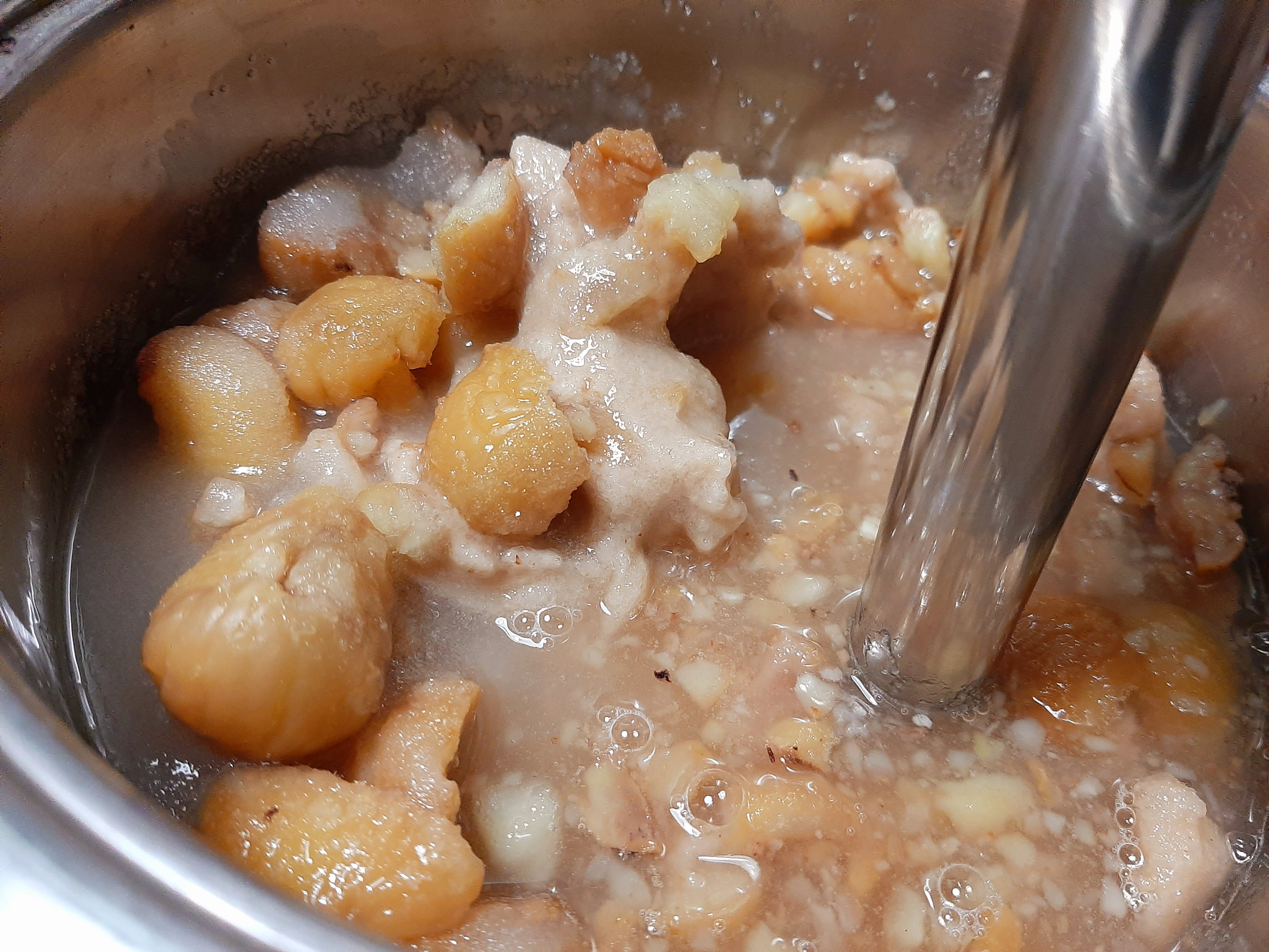 Incidete in tutta la lunghezza ciascuna castagna con l'attrezzo specifico oppure con un coltellino affilato. Raccoglietele in una pentola, copritele a filo d’acqua, aggiungete un cucchiaino di sale grosso e portate a ebollizione. Cuocete per circa 40 minuti. Scolatele, eliminate con cura le bucce, esterna ed interna, ma in modo piuttosto veloce altrimenti se le castagne si raffredderanno, l'operazione diventerà più difficile. Frullatele con un mixer fino ad ottenere una crema liscia.
