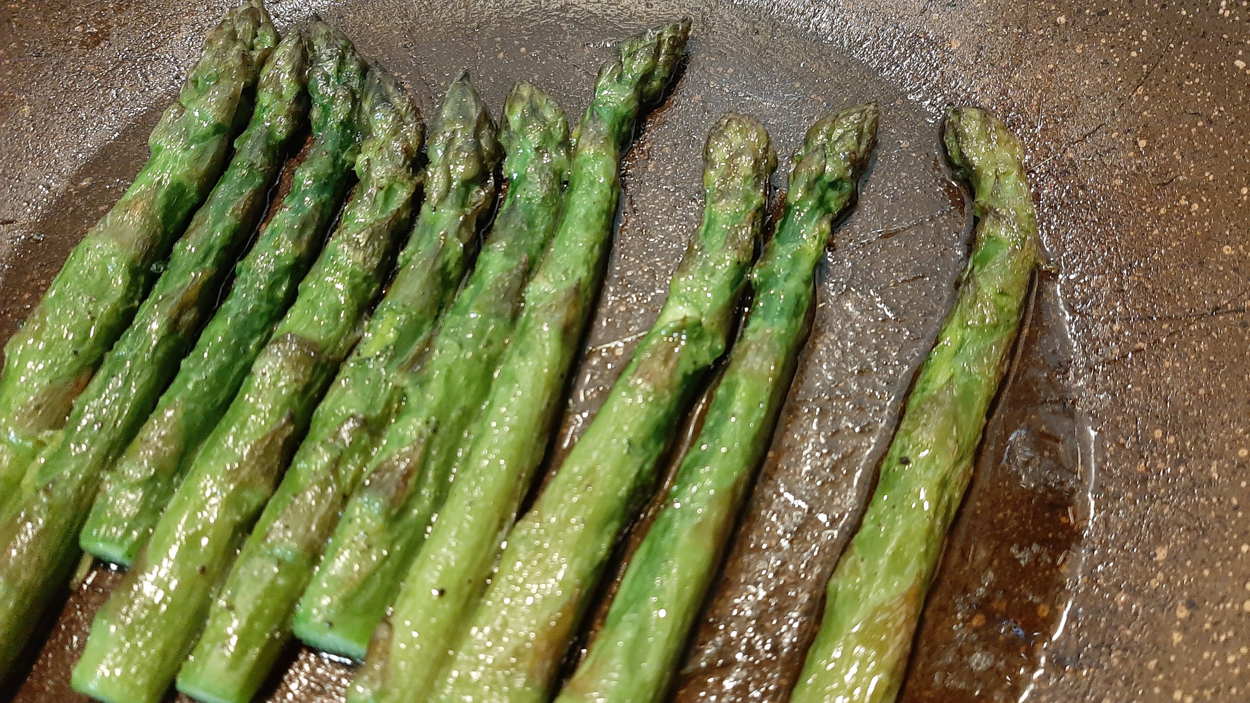 3 Preparate gli asparagi, tagliando la parte finale del gambo e tenendo da parte le 12 punte più belle con una parte di gambo per una lunghezza di 10/12 cm per guarnire il piatto. Con uno spelucchino eliminate la parte più esterna e dura della parte finale dei gambi. Tagliate a rondelle i gambi e le punte scartate. Fate prima sbollentare per qualche minuto, tutti gli asparagi, in acqua salata e poi passateli in padella con l'olio per una breve cottura in modo da mantenerli leggermente croccanti e ben asciutti.