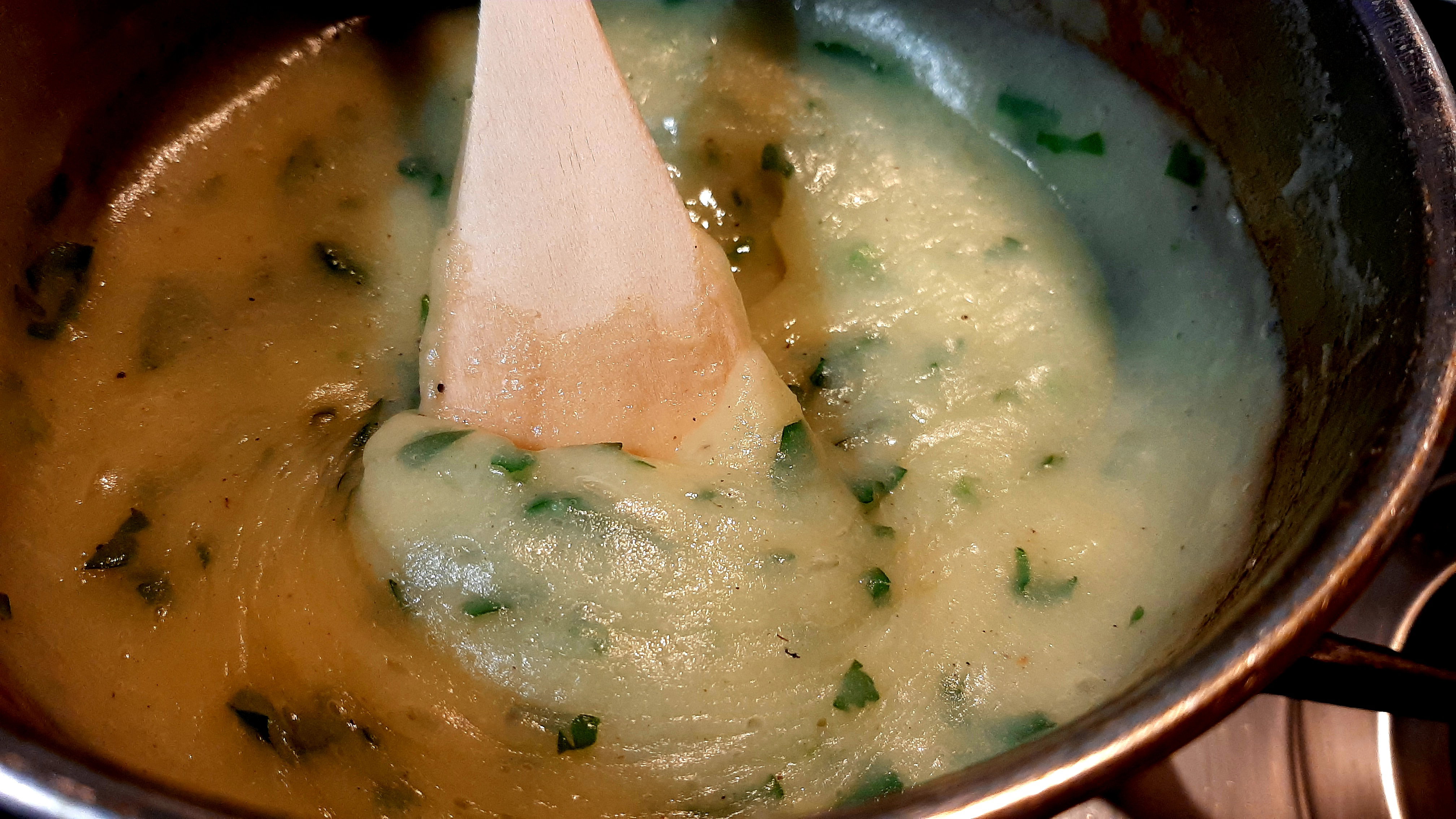 5 Sbucciate la patata, tagliatela a dadini e cuocetela in acqua salata. Quando sarà cotta, col frullatore a immersione, riducetela in crema, aggiungendo qualche foglia di prezzemolo ed emulsionando con l’olio aggiunto a filo.