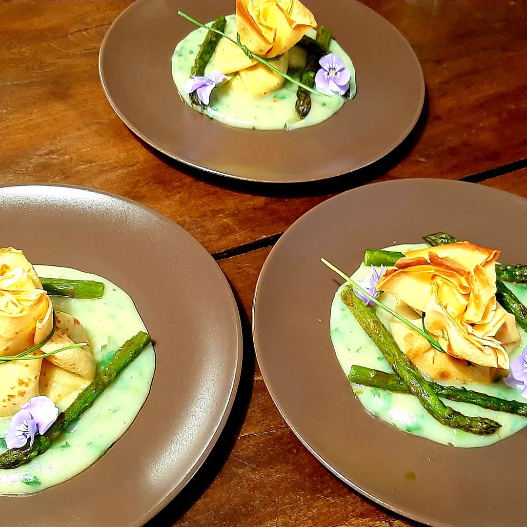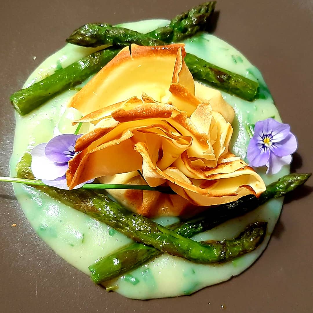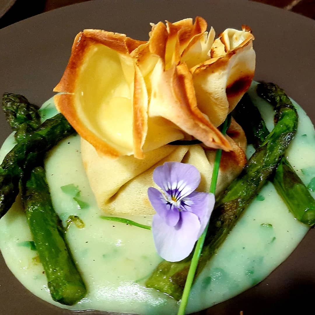 6 Sostituite lo spago con uno stelo di erba cipollina. Sistemate la crema di patate sul fondo dei piatti, adagiatevi i fagottini, decorate con le punte di asparagi che avete conservato precedentemente, qualche fiore edulo e servite.