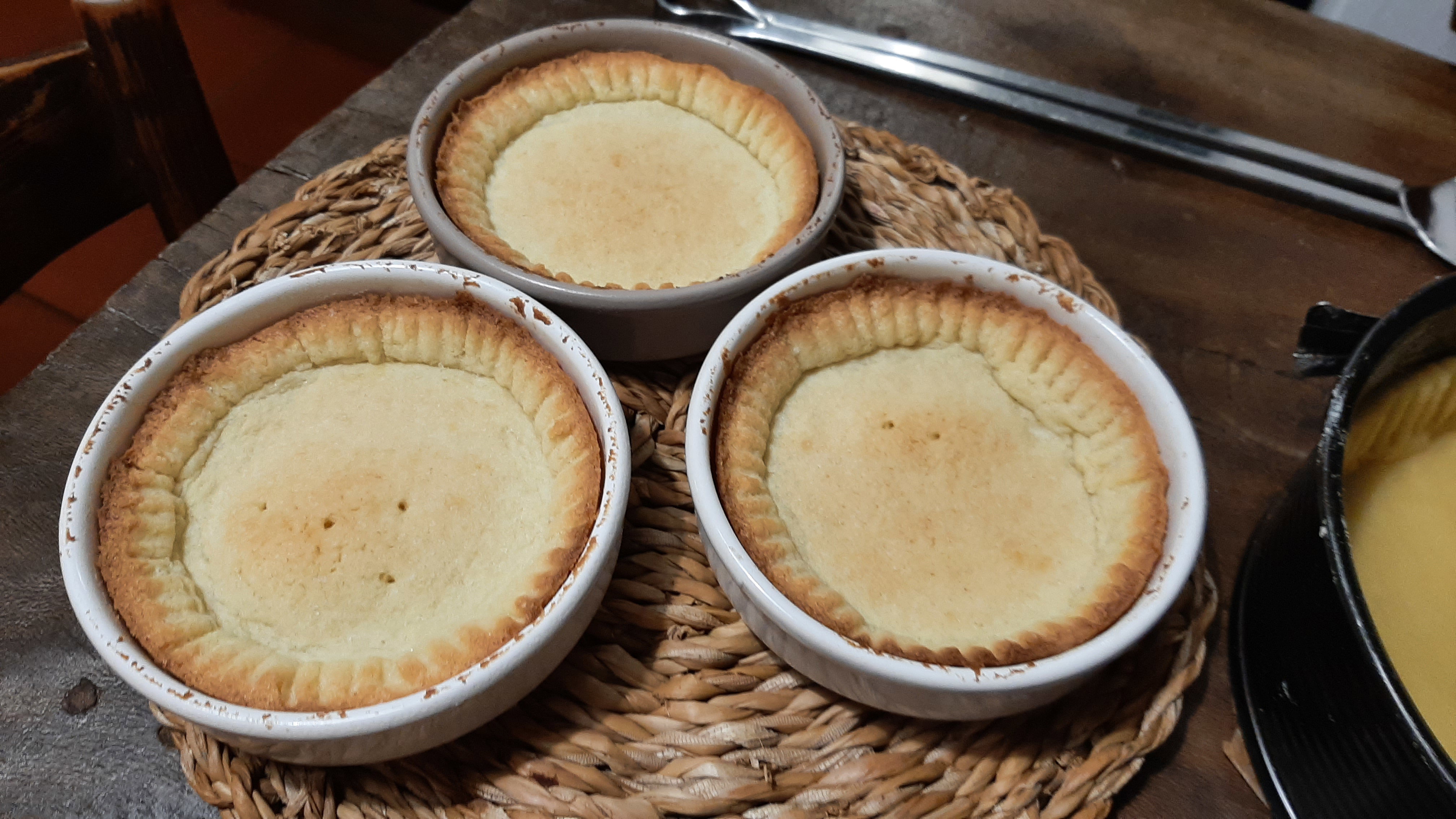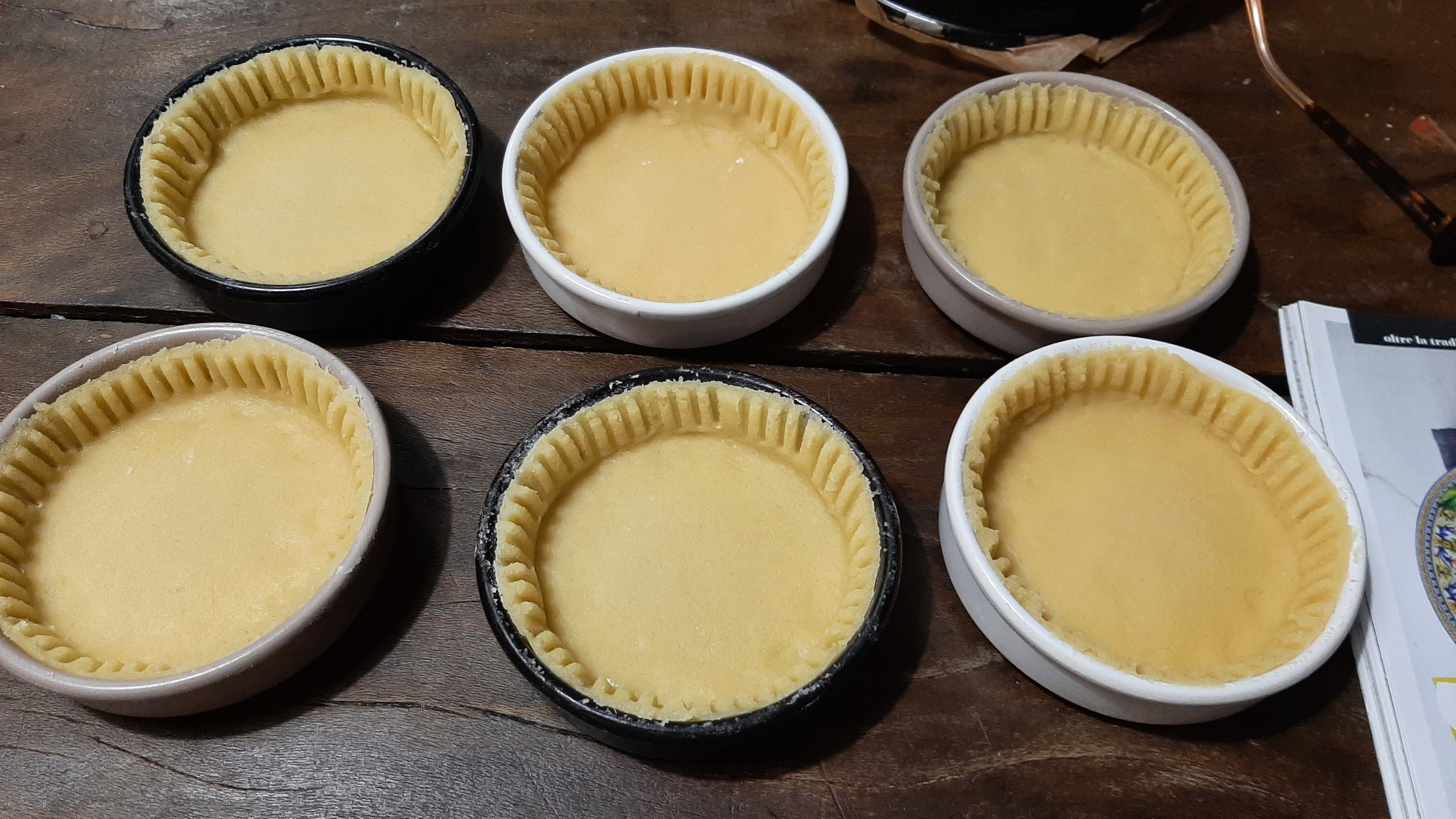 Lasciate intiepidire. Riprendete la frolla riposta in frigo, infarinate leggermente la spianatoia e, con il mattarello, stendete la frolla allo spessore di circa mezzo cm. Imburrate ed infarinate gli stampini, formate dei cerchi di frolla un poco più grandi degli stampini, adagiateli all'interno degli stampini ed eliminate con un coltello la frolla in eccesso.