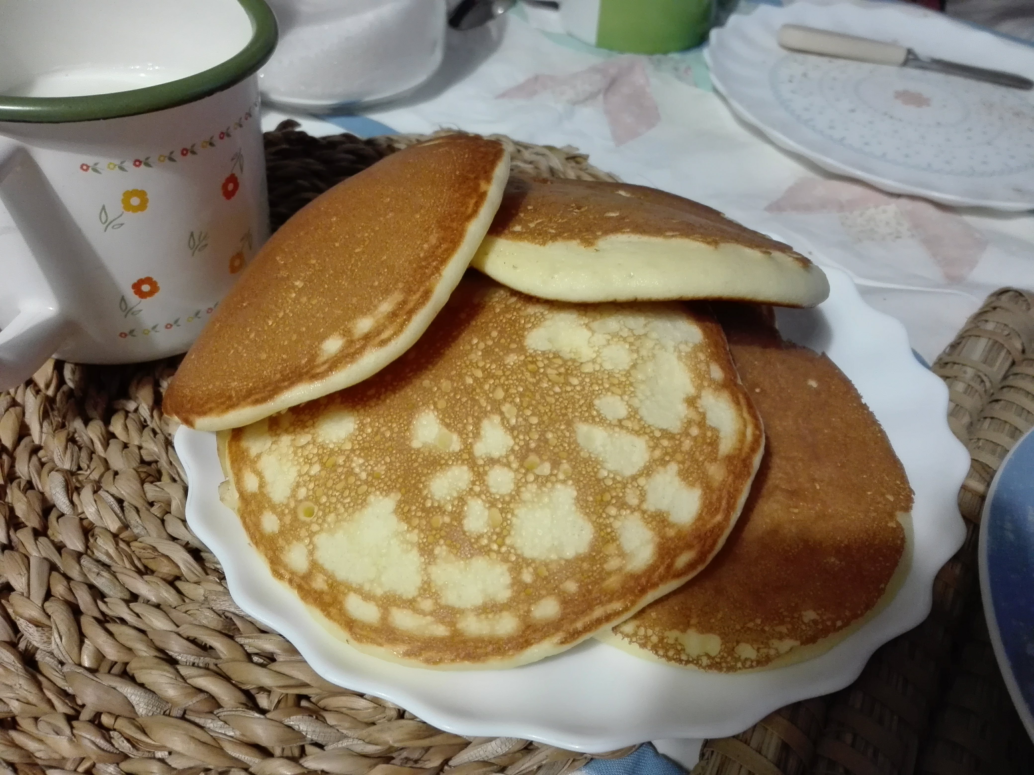 Munitevi di una padella antiaderente, di piccole dimensioni, senza graffi e con un coperchio. Passate poco burro in padella e poi assorbitelo con una carta assorbente. Con un piccolo mestolo, versate la pastella, al centro della padella già calda e cuocete con la fiamma al minimo ed il coperchio. Lasciate cuocere per circa 15 secondi, controllate sollevando il coperchio, e, appena compariranno delle bollicine in superficie, con una paletta, girate i pancake dall’altro lato e fate cuocere ancora 15 secondi senza il coperchio. Una volta pronti disponeteli in un piatto senza sovrapporli. Ripetete l'operazione fino a esaurimento dell'impasto. Consumateli per una colazione sostanziosa, aggiungendo degli sciroppi, frutta a piacere e una spolverata di zucchero a velo.