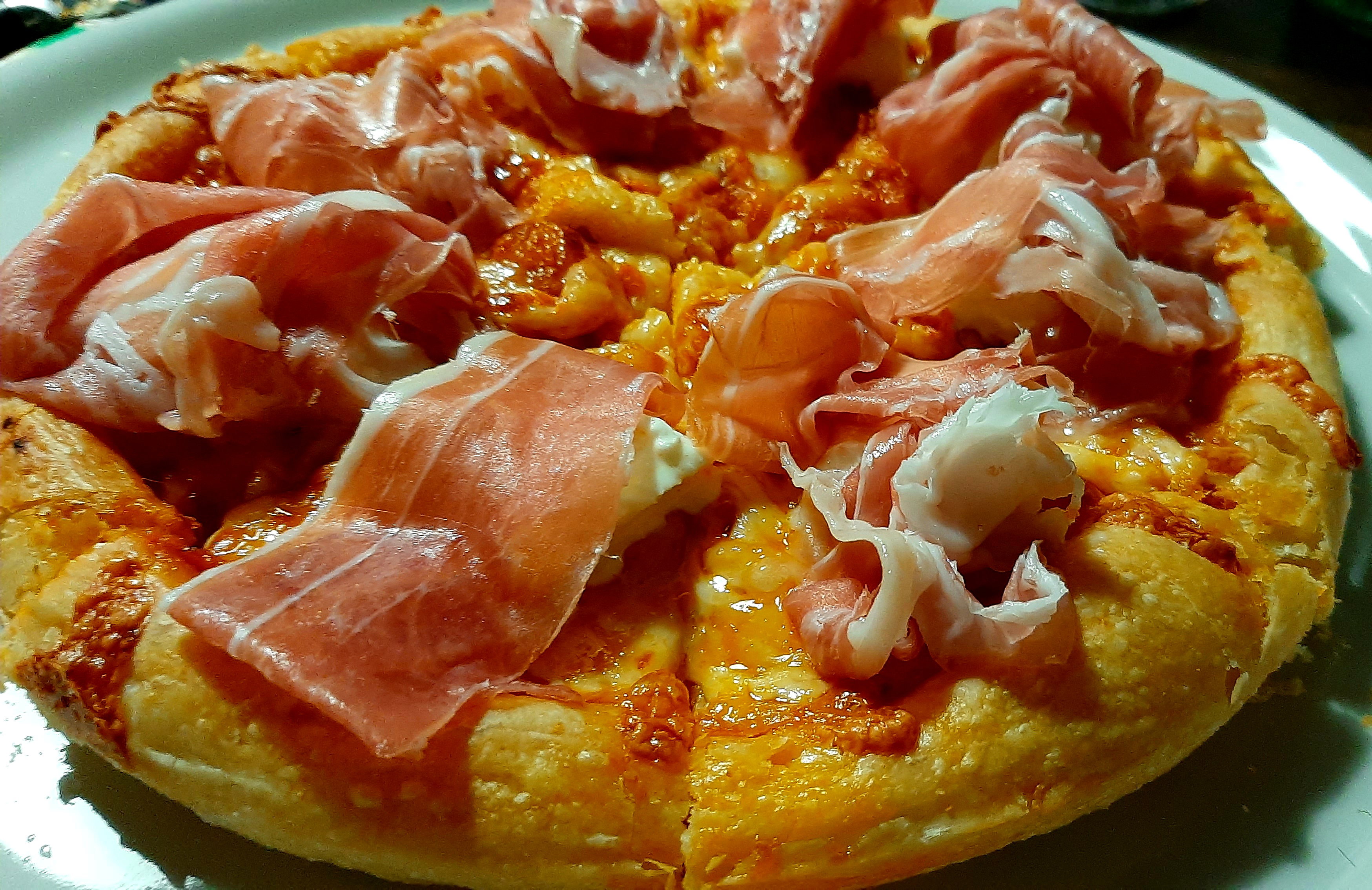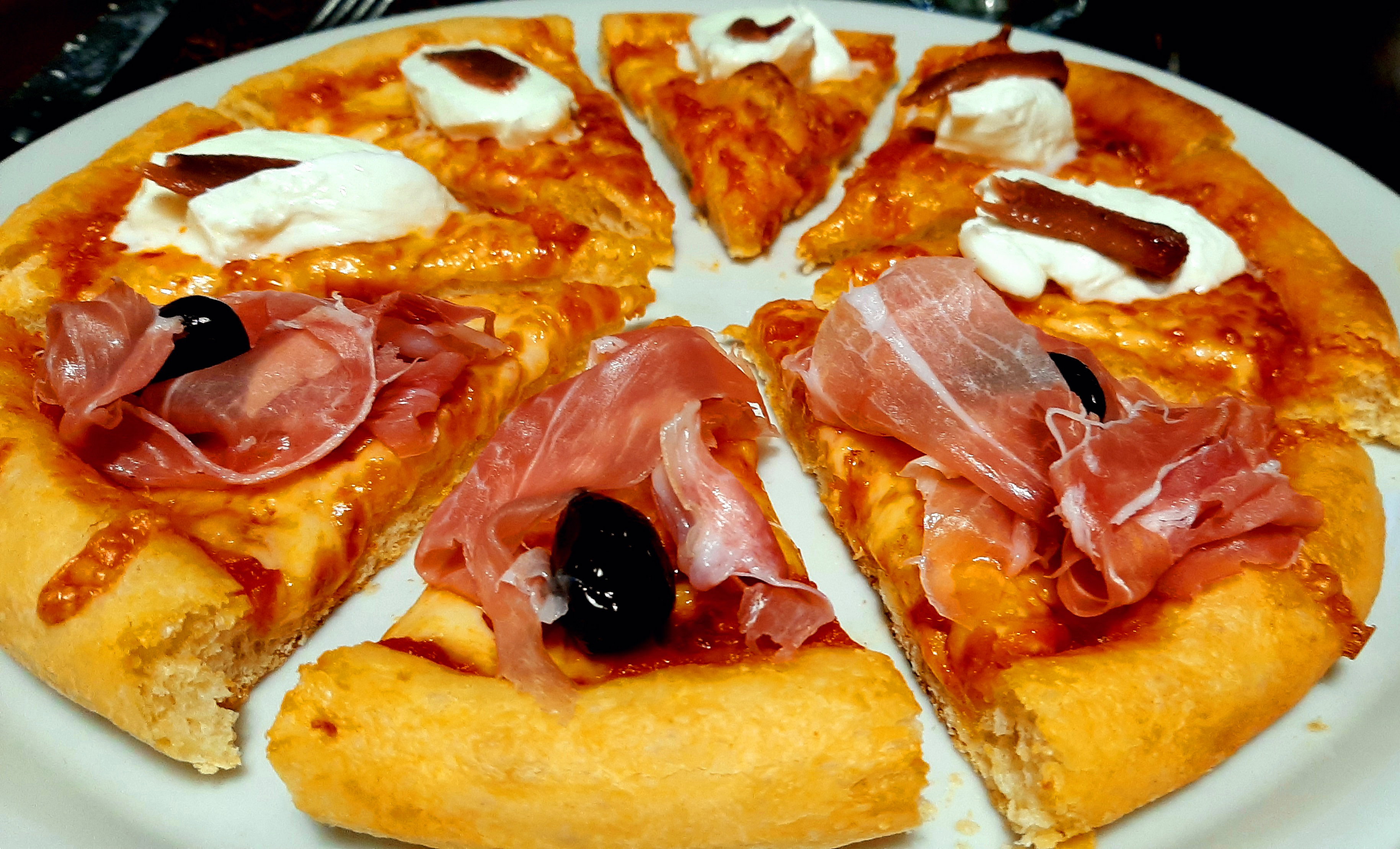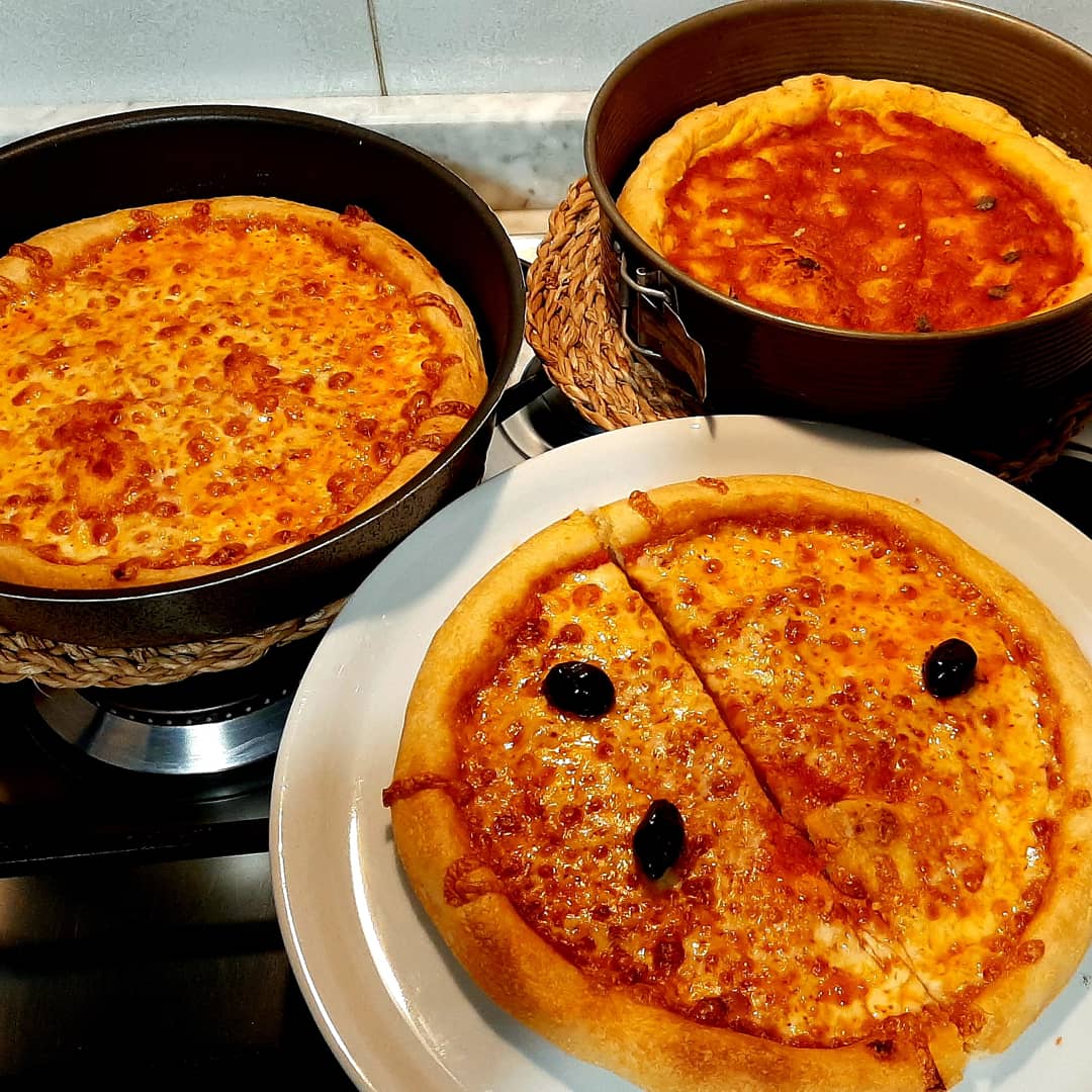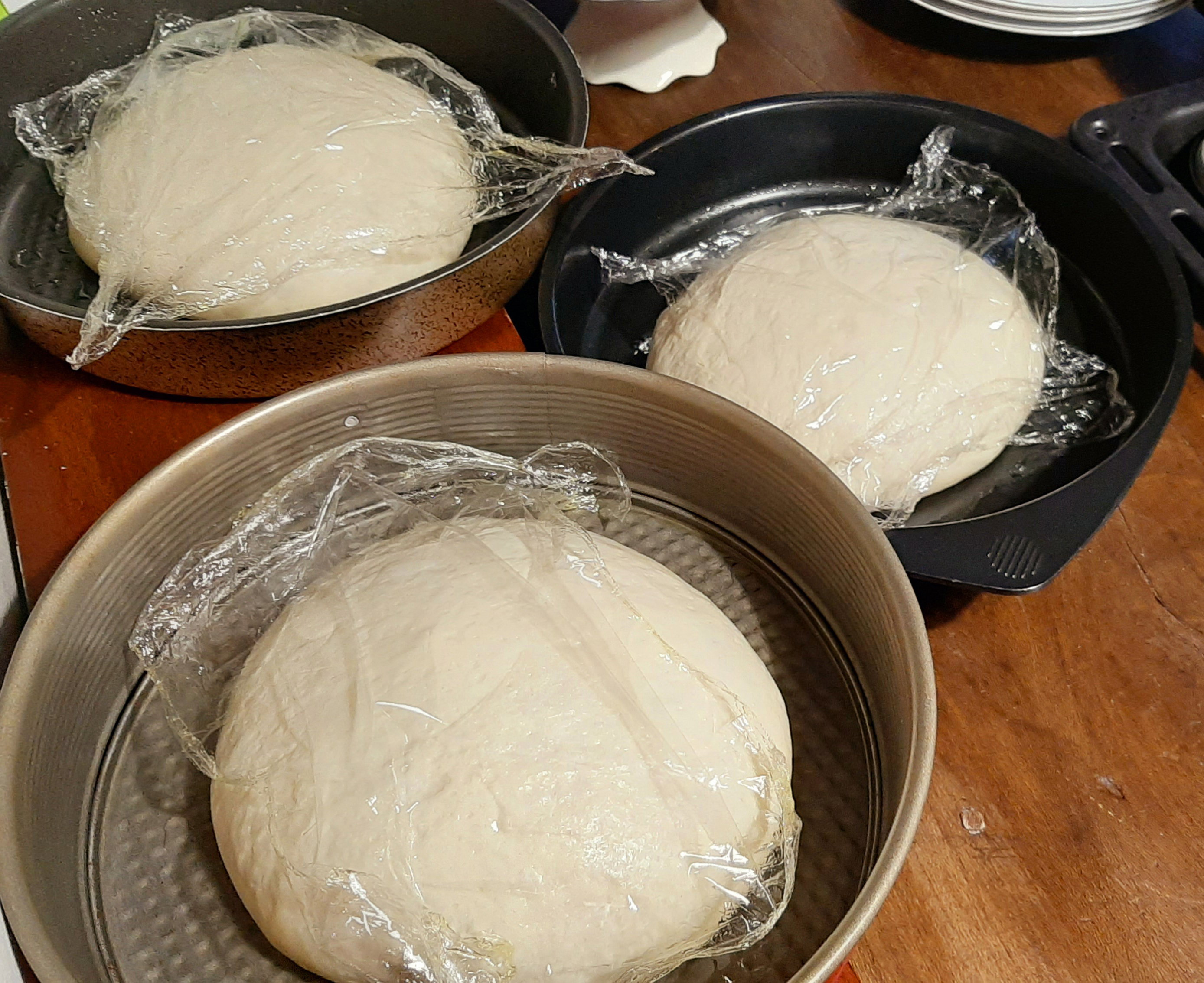 Appiattite bene la parte centrale (senza però eliminare eventuali bolle formatesi in lievitazione) fino a uno/due centimetri dal bordo in modo che questo rimanga gonfio per formare il cornicione. Potete ora procedere con la farcitura stendendo un piccolo mestolo di sugo o salsa ed infine distribuite uniformemente abbondante mozzarella aggiungete un pizzico di sale e un giro di olio. Lascite riposare le pizze già guarnite, in ambiente caldo, ancora per un'ora. Preriscaldate il forno alla temperatura massima ed infornate le tre teglie rispettivamente nella zona inferiore del forno, in quella intermedia ed in quella superiore. Dovrete controllare, a vista, la cottura per evitare che si brucino sotto e sopra. Invertite la disposizione delle teglie un paio di volte in modo che tutte raggiungano il giusto grado di cottura. Ci vorranno circa 35/40 minuti. Sfornate le pizze, tagliatele in 8 spicchi e guarnitele con gli ingredienti freschi: fette di mozzarella di bufala, acciughe, olive, basilico o altro in base al gusto. Potrete ora assaporare una pizza croccante sul cornicione e fragrante nella parte centrale. Se volete ottenere una pizza con l'effetto del forno a legna e con un gusto più "bruciacchiato" potete cuocere le pizze per i primi 5 minuti in una padella antiaderente o di ferro o di ghisa con un coperchio e poi completare la cottura in forno.