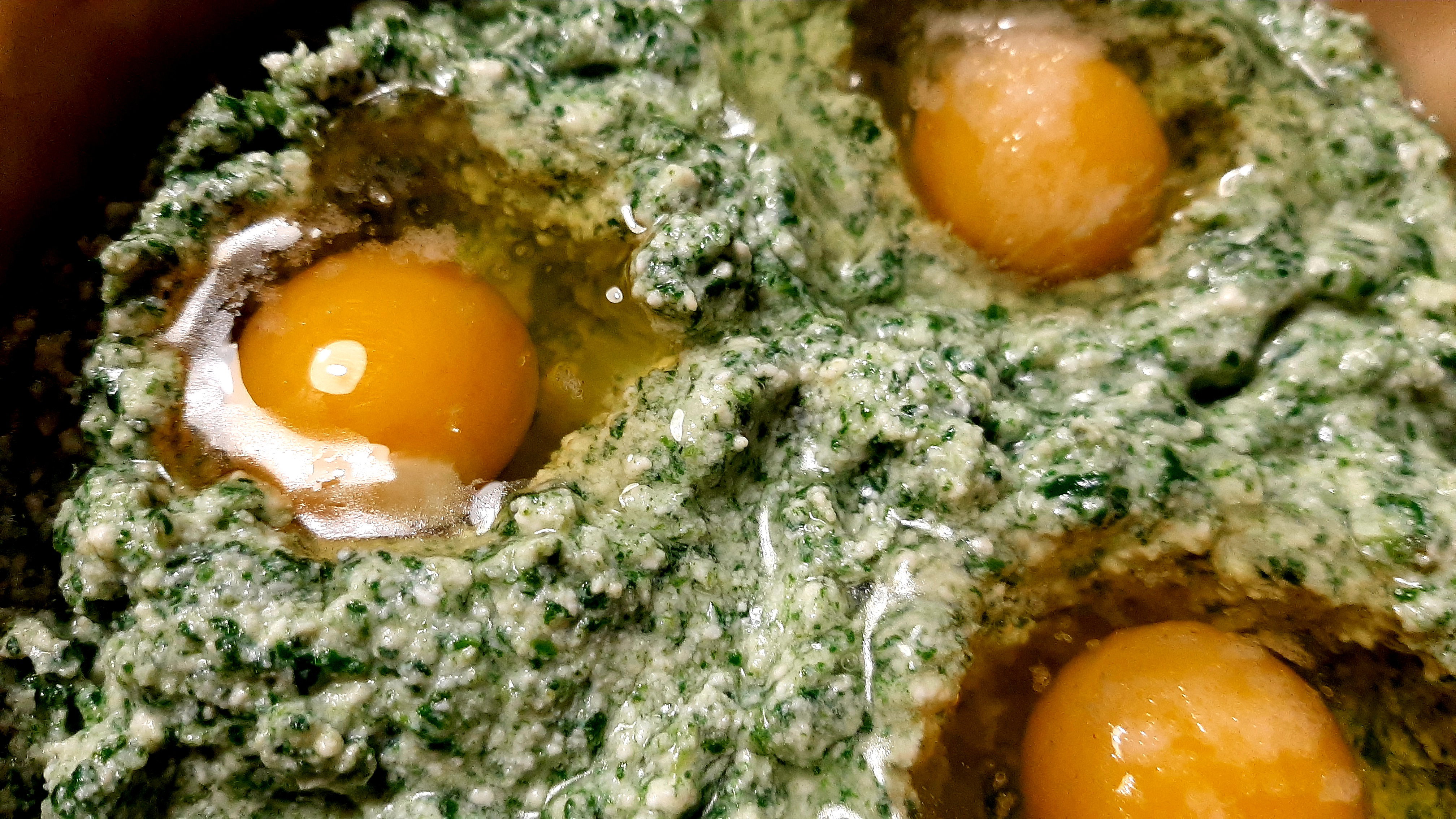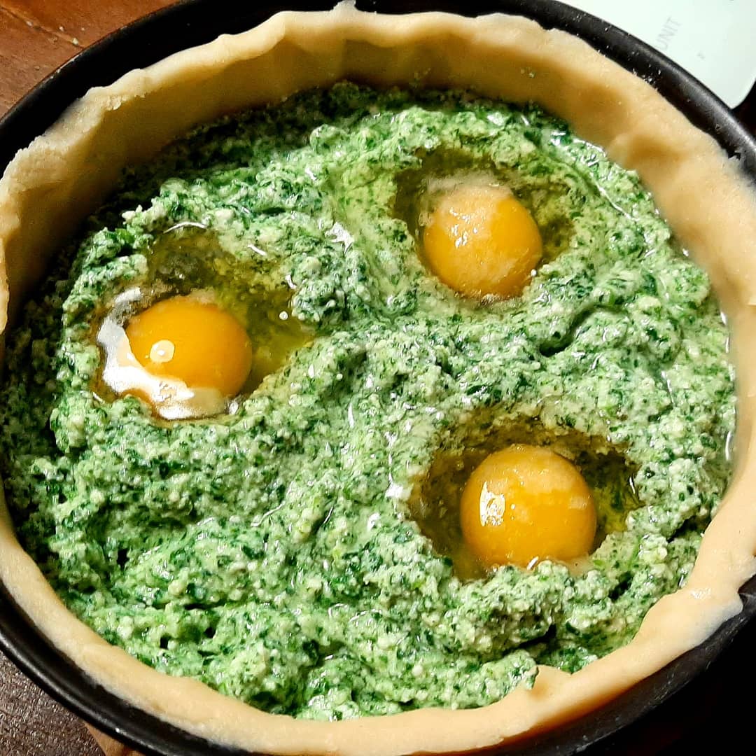 Fate raffreddare completamente e sminuzzateli in modo grossolano, con le lame di un robot. Aggiungete la ricotta ben sgocciolata, il parmigiano, il sale e un uovo. Mescolate con la forchetta fino ad ottenere una farcia cremosa. Riprendete la pasta brisèe dal frigo, dividetela in due parti e stendetela in una spianatoia con uno spessore di 1/2 cm, in modo da ricavarne due dischi, dei quali, uno, sufficientemente grande per rivestire anche il bordo della teglia. Adagiate la sfoglia in una teglia apribile, rivestita di carta forno. Versate la farcia di spinaci e ricotta. Create tre cavità in cui verserete le uova. Posizionate un uovo col guscio al centro. Operate un foro centrale nella seconda sfoglia e richiudete la torta pasqualina adagiandola e facendo coincidere il foro con l'uovo centrale. Sigillate il bordo esterno e, con la pasta eventualmente rimasta, formate dei cordoncini per decorare la superficie. Bucherellate la superficie. Spennellate con un uovo.